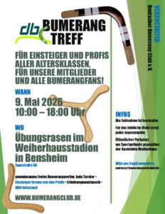 Am 09. Mai von 10:00 – 18:00 Uhr findet auf dem Übungsrasen des Weiherhausstadions findet ein Treffen für alle Freunde und Interessierte des Bumerangsportes statt.